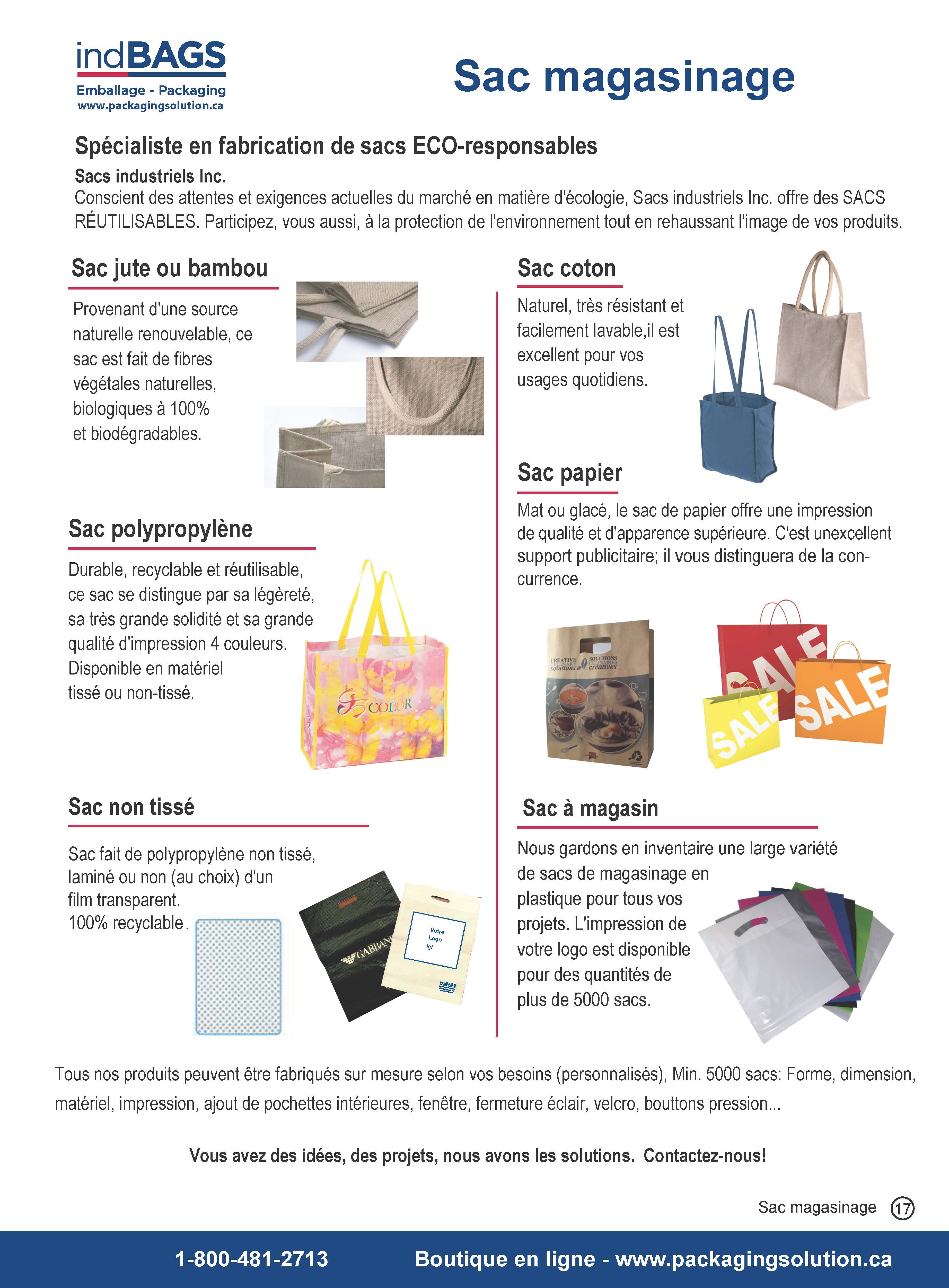 Conscient des attentes et exigences actuelles du marché en matière d’écologie, Sacs Industriels Inc. offre des sacs réutilisables. Participez, vous aussi, à la protection de l’environnement tout en rehaussant l’image de vos produits.